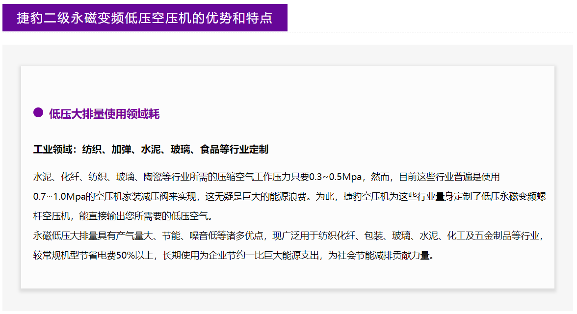 *低壓大排量變頻螺桿空壓機(jī):采用捷豹自研的永磁液冷式電機(jī),保證永磁電機(jī)中永磁體安全低溫,高能效穩(wěn)定。相對(duì)于傳統(tǒng)的永磁變頻,效率提升10%,為您節(jié)省大筆的電費(fèi)。