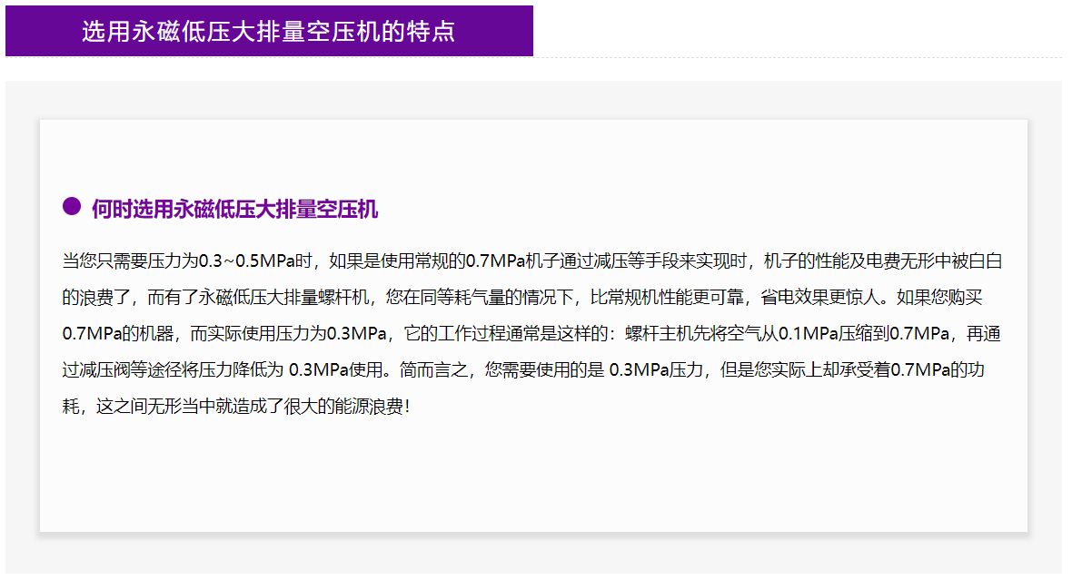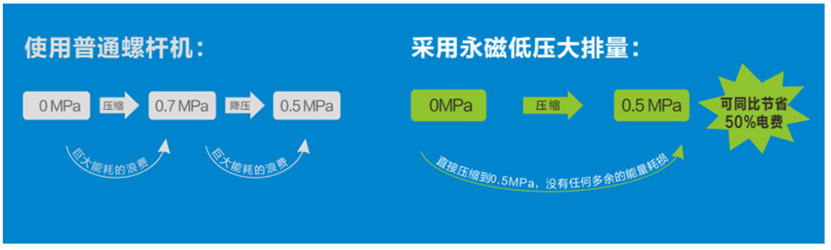 *低壓大排量變頻螺桿空壓機(jī):采用捷豹自研的永磁液冷式電機(jī),保證永磁電機(jī)中永磁體安全低溫,高能效穩(wěn)定。相對(duì)于傳統(tǒng)的永磁變頻,效率提升10%,為您節(jié)省大筆的電費(fèi)。